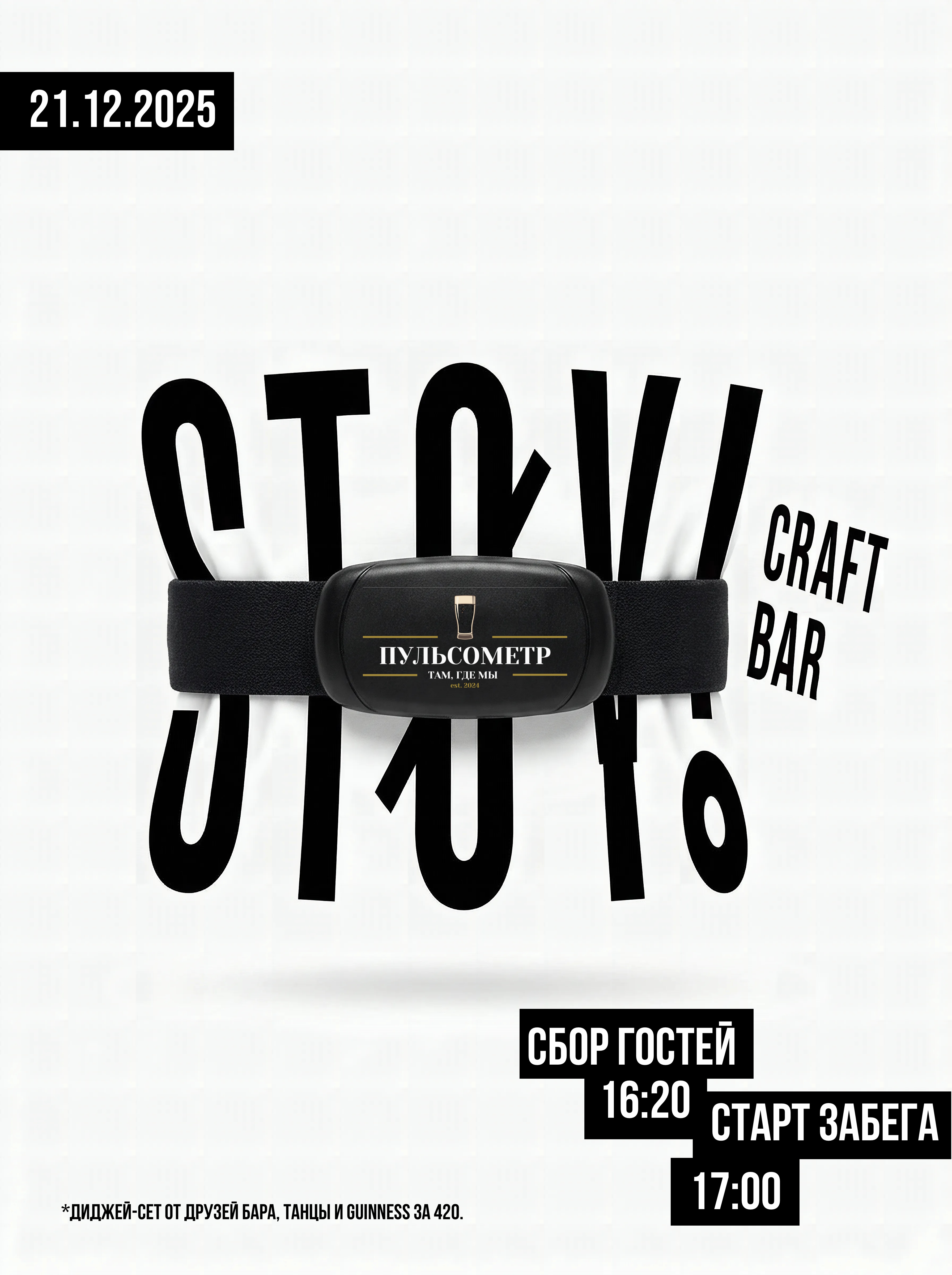 Что ж, осталось написать про главную вечеринку года — “Финиш года в баре ПульсØметр”. Решили порадовать бегунов Гиннесом за 420 рублей. Позвали диджея, фотографа, сделали трек в формате бокала — всё в лучших традициях.