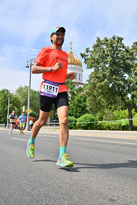 Бегал темповые работы, пару длительных (как проверку перед 42,2 км) и сами марафоны: “Зелёный” и Московский. Если в двух словах: ASICS Noosa Tri 14 — это стартовые кроссовки для любителей, причем не обязательно триатлетов. Лёгкие — 260 г в размере US 9. С хорошим возвратом энергии. Помните, как я прыгал у подъезда? Вот это как раз оно. И в меру стабильные. Стабильность я определяю так: если 25 км по грунту не расшатали мне голеностоп, то кроссовки стабильны. Например, любимые ASICS Novablast расшатывают, и на марафоне я чувствую дискомфорт уже после 30 км. В Noosa Tri 14 оба раза на марафоне всё было тип-топ.